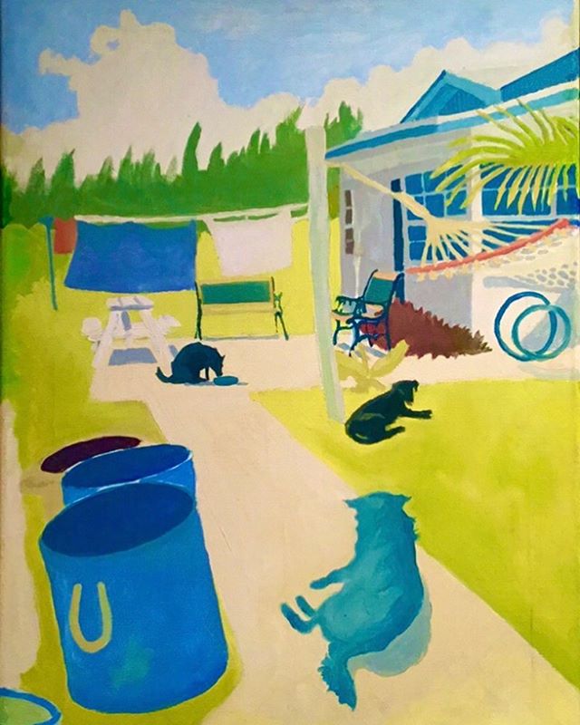 It was the coconut tree set against the giant Naples yellow cloud & approaching storm which first stopped me in my tracks that evening in Exuma. The 2 dogs known as ‘Potcakes’ then caught my eye.